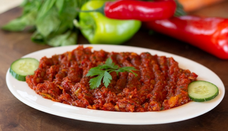 İnce doğranmış domates, soğan ve baharatların acı sosla harmanlandığı meze.