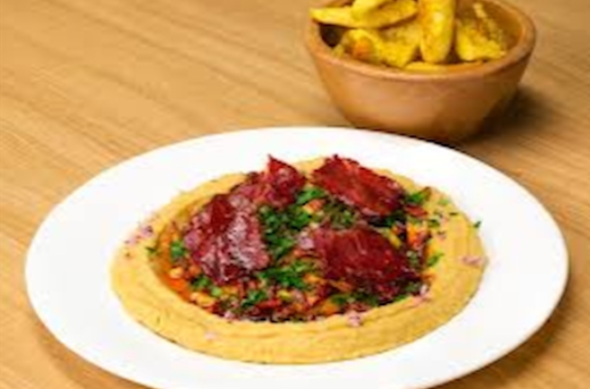 Klasik humusun üzerine pastırma eklenerek hazırlanan farklı ve iştah açıcı meze.