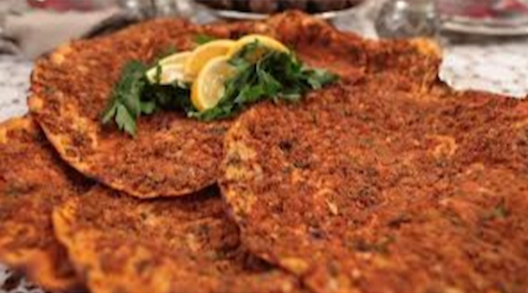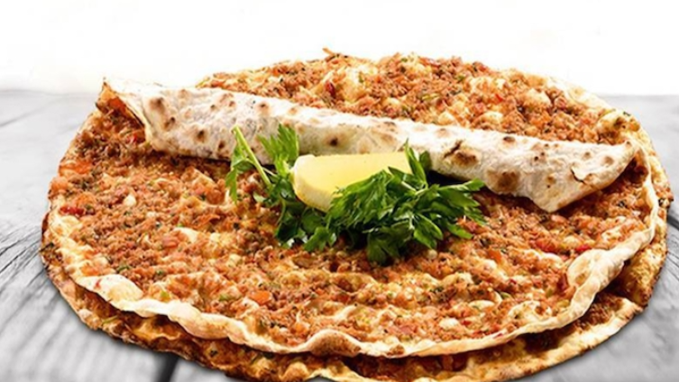 Klasik ince hamur üzerinde kıymalı harçla hazırlanan, tek porsiyon nefis lahmacun.