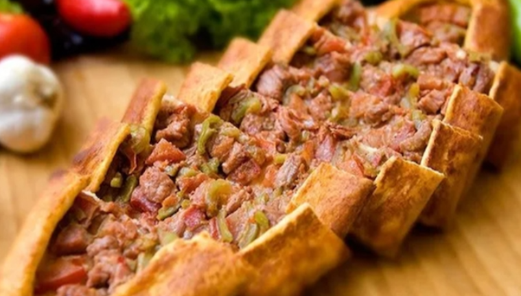 Küp doğranmış et ve baharatlarla hazırlanan, fırından çıkan nefis pide.