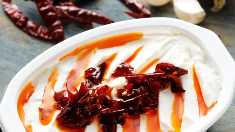 Yoğurt üzerinde kızdırılmış acı biber yağıyla sunulan bol acılı iştah açıcı.
